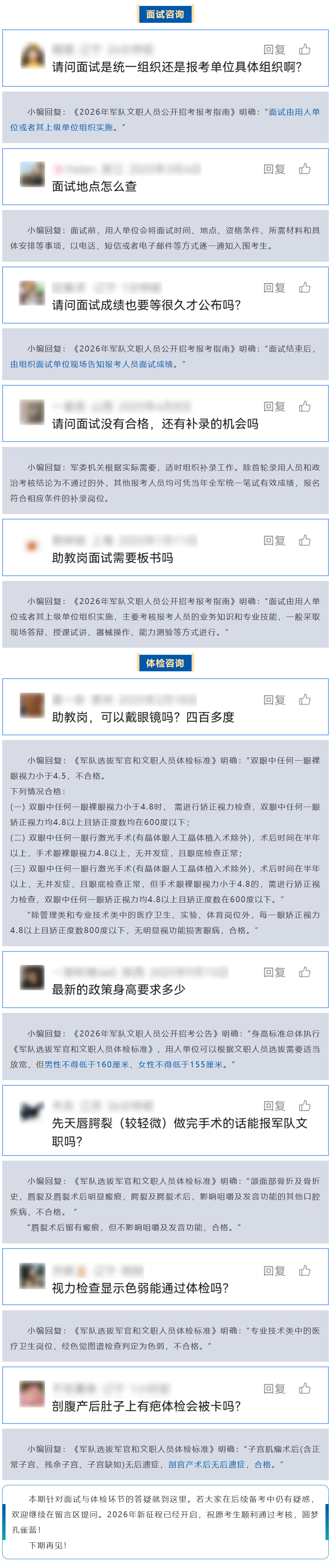 《2026年軍隊文職人員公開招考公告》明確,公開招考筆試成績將于本月底左右正式公布。成績發(fā)布后,面試、體檢等工作將陸續(xù)展開。為幫助大家精準把握后續(xù)有關問題,我們整理了本期“答考生問”,供您參考。