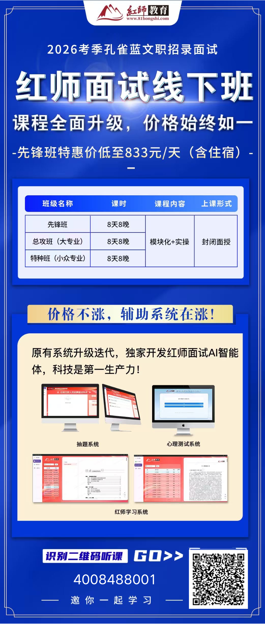 2026軍隊文職面試工作即將展開,紅師教育以“先鋒班特惠價低至833元/天(含星級住宿)”的實在價格回歸廣大考生。低價不等于低質(zhì),真正支撐其八年口碑與學員信賴的,是那一套深度融合軍政素養(yǎng)要求與實戰(zhàn)答題方法論的 “紅師殺手锏”。