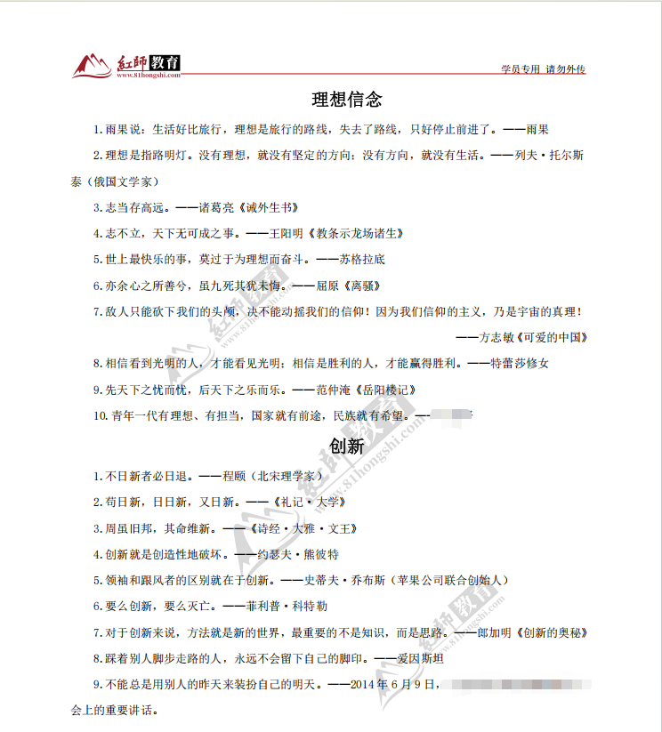 1.雨果說(shuō):生活好比旅行,理想是旅行的路線,失去了路線,只好停止前進(jìn)了。一一雨果2.理想是指路明燈。沒(méi)有理想,就沒(méi)有堅(jiān)定的方向:沒(méi)有方向,就沒(méi)有生活。--列夫.托爾斯(俄國(guó)文學(xué)家)