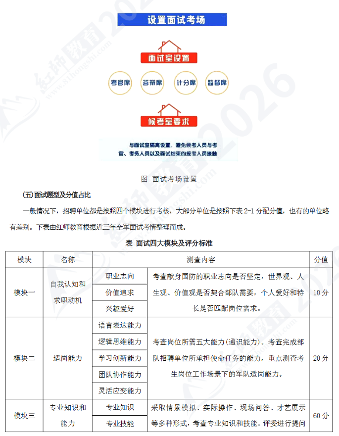 在軍隊文職面試工作中,招聘單位特別注重考生的實際工作能力,通常會將情景模擬和實際操作考核作為面試考核的重點(見圖)。比如,管理崗位注重考核考生的靈活應變能力;專業(yè)技術崗位重點考核試講、說課;醫(yī)護類崗位重點考核護理操 作;文體類崗位重點考核才藝展示等。