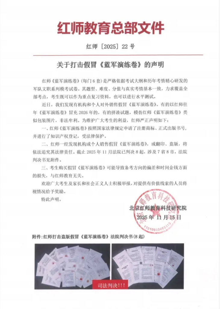 紅師教育丨關(guān)于打擊假冒《藍(lán)軍演練卷》的聲明 2025-11-25