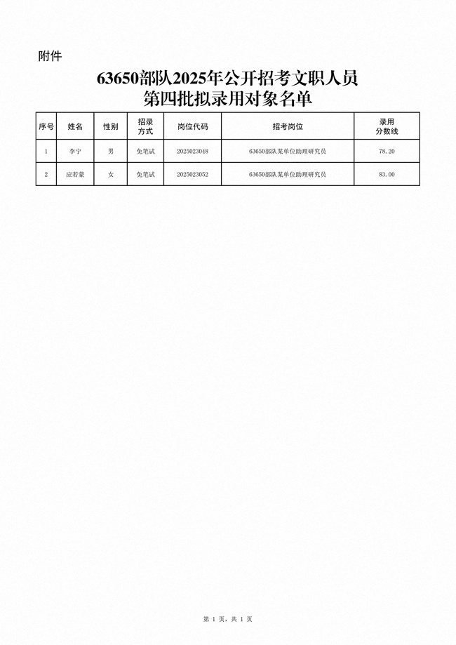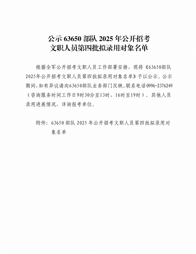 原文標題:公示63650部隊2025年公開招考文職人員第四批擬錄用對象名單