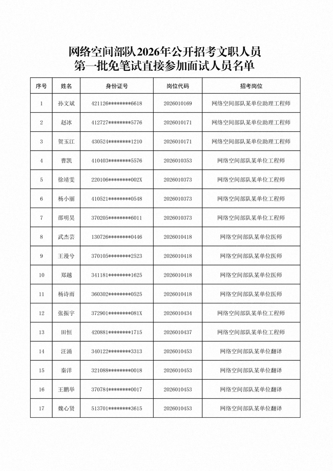 原文標(biāo)題:公布網(wǎng)絡(luò)空間部隊(duì)2026年公開招考文職人員第一批免筆試直接參加面試人員名單